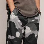 The phantom drift camo track pants fuse grayscale camo with utility details and breathable comfort, crafted for movement and everyday edge. close-up
